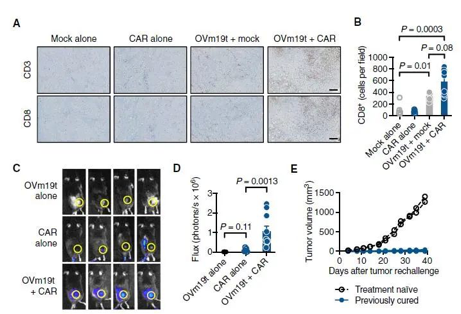 研究分析表明,CD19-CAR T细胞介导的肿瘤杀伤还诱导了垂死的肿瘤细胞释放病毒,从而传播了CD19t的肿瘤表达。而且,用溶瘤病毒和CAR T细胞组合治愈的癌症小鼠表现出保护性抗肿瘤免疫力的延长。这说明,免疫系统建立了对肿瘤的记忆反应。